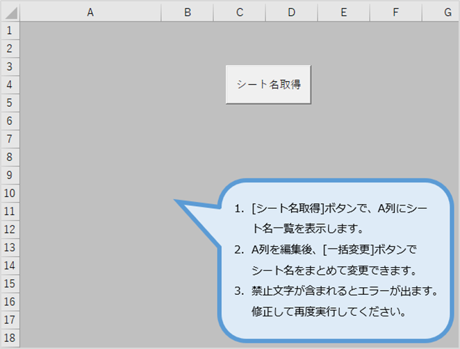 - [編集シート] の [シート名取得] ボタン をクリック → シート名が一覧で表示される